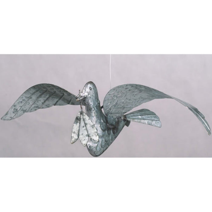 Our Peace Dove, with an olive branch in its mouth, has a plastic loop to hang from any hook, tree or mobile display. Galvanized. They move in a gentle breeze. A perfect gift.