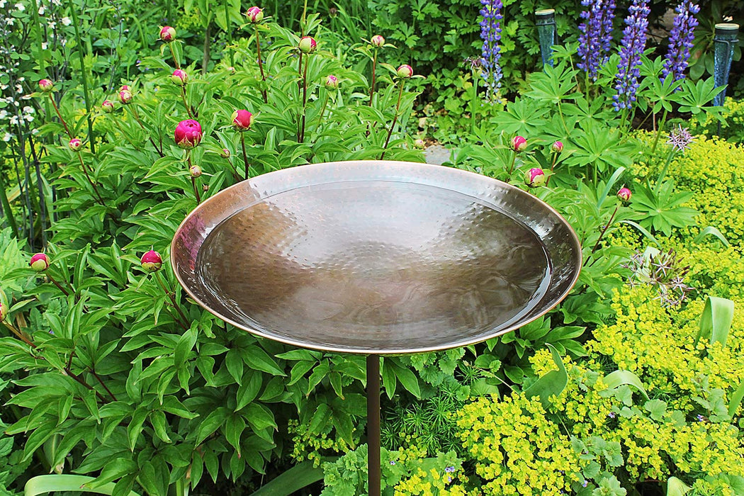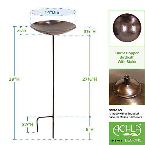 A lovely garden accent adds depth, dimension, and a focal point to a perennial bed, water feature or other natural setting. The Burnt Copper Birdbath from Achla Designs is a beautiful garden decoration designed to benefit the wildlife in your yard. Birds will love having a safe place to cool off and drink some water, and gardeners will love having this piece to complement the plantings. The simple bowl is made of stainless steel with a subtle texture of hammered concentric rings, plated in Copper, with an Antique finish. The threaded bowl attaches to a 36" wrought iron garden stake. Makers of fine quality goods for the home and garden since 1994, we offer a full line of Achla Designs wrought iron landscape structures, plant supports and stands, birdbaths and other decorative garden elements for the patio, porch, deck and yard.