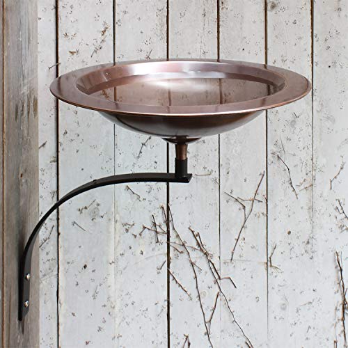 This Wall-Mounted version of our Classic Birdbath has a simple copper bowl with a wide rim for birds to perch while drinking and bathing. Ideal for porches, decks and fence posts, the bowl has a threaded base that attaches to the wrought iron Wall Bracket. Two mounting holes and hardware are provided.