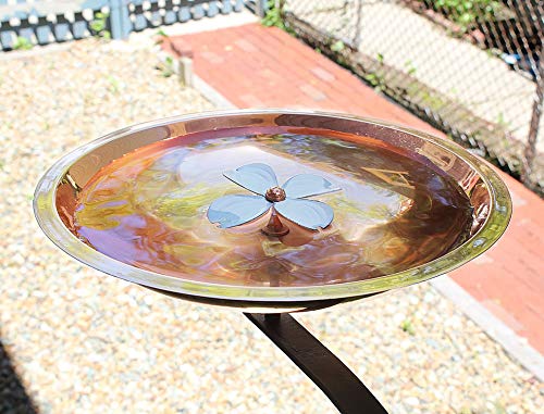 This Rail-Mounted Dogwood Birdbath was specifically designed with our pollinator friends in mind. The simple copper bowl has a white dogwood flower that fits into the center. Allowing the petals to dip into the water's surface provides a landing place for bees and butterflies to sip at the edge without falling in. Use it with or without the addition of glass beads or stones. Perfect for porches, balconies or deck rails, the wrought iron bracket has C-type clamp that holds the bracket to the railing without need for drilling or permanent mounting.