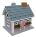 The Home Bazaar Vineyard Cottage Birdhouse in ocean gray offers a charming coastal retreat for small cavity-nesting birds. This quaint design is highlighted by two vibrant red flower window boxes and an inviting pink door, lending a warm and welcoming feel. Gray shingles and a faux brick chimney provide authentic architectural detail, enhancing its picturesque appeal. Crafted from sturdy exterior-grade plywood and enhanced with intricate poly-resin accents, this birdhouse ensures durability and weather resistance. It features a 1.25-inch entry hole suited for wrens, chickadees, and finches, along with essential drainage and ventilation systems to maintain a healthy interior environment. The removable back walls simplify cleaning and maintenance, while the included mounting bracket and convenient swing-up paddle-board on the back make hanging effortless and secure. Expertly designed, the Vineyard Cottage Birdhouse combines aesthetic elegance with practical functionality, evoking the serene charm of Martha’s Vineyard beaches in your own backyard. Item Dimensions: 7. 75” H x 8.75" W x 6. 2"5 D.