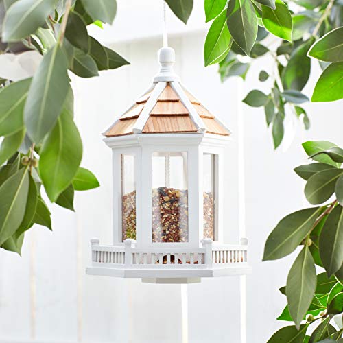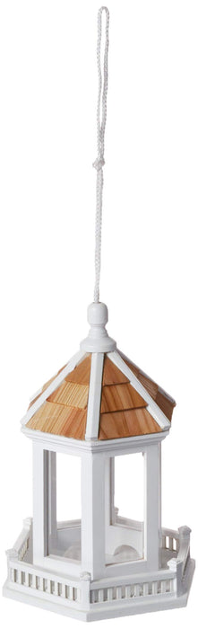 This classic style Gazebo Feeder is topped with a pine shingled roof and a railing all around. The top cone lifts up along the heavy-duty nylon cord (9.75” long) to access the large cavity capable of holding over 1.5 lbs. of seed. The seed tray has drainage holes to allow water to escape. The top of the feeder lifts up to fill with seed and is 3.5” wide in diameter. This piece can be cleaned by lifting up the top and rinsing 1x-2x a year with a mild soapy water, Feeder be completely dried before adding seed. There are 6 crescent shaped openings at the bottom where the seed is dispensed, each approx. 1.0" wide with a 3/4" height. Will handle all types of seed. Item Dimensions: 11” H X 8. 5” W X 8. 5” D