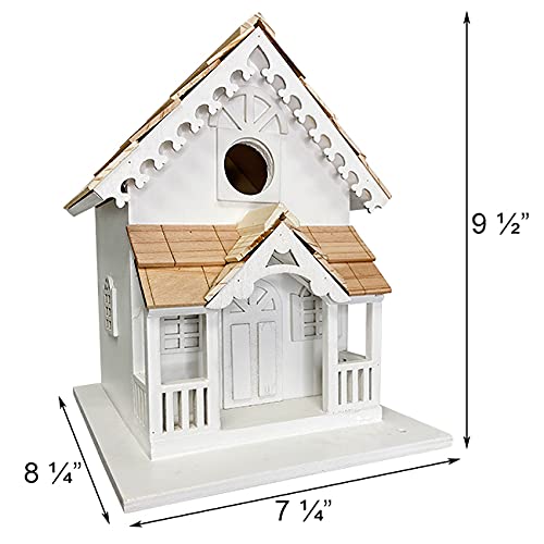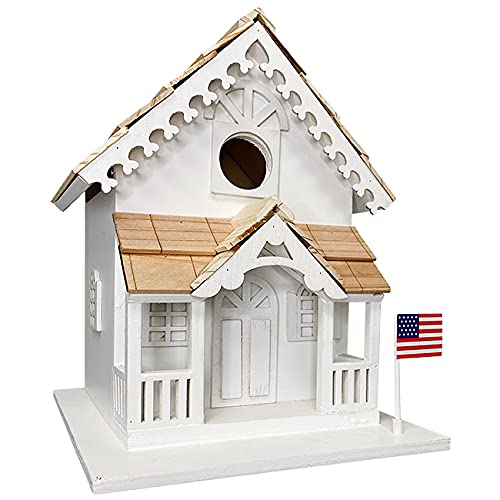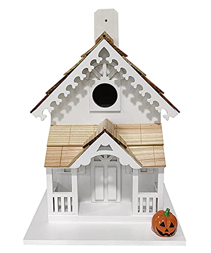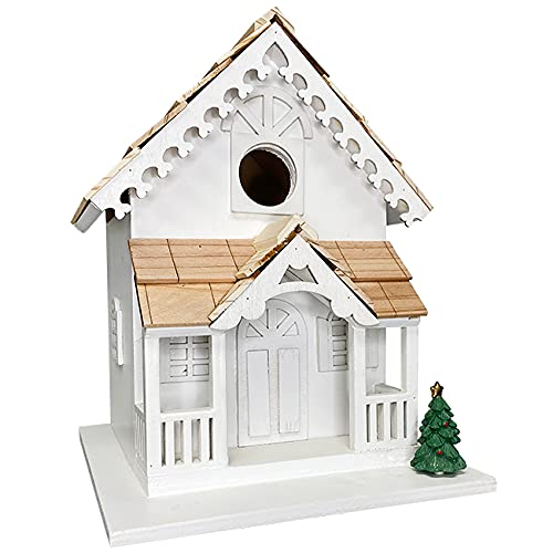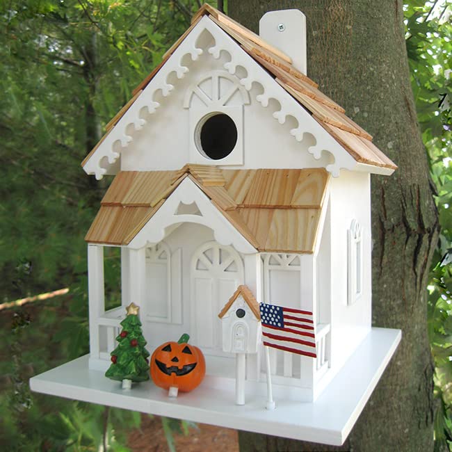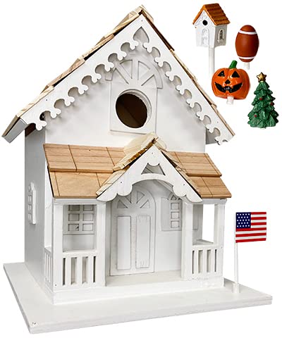 The Season’s Tweeting’s Birdhouse offers a versatile and charming cottage-style home, specially designed with five interchangeable seasonal decorations to celebrate throughout the year. Included are an American flag, a Jack-O-Lantern, a Christmas tree, a springtime birdhouse, and a bonus football decoration, allowing you to easily customize the look to match any season or occasion. Crafted from durable exterior-grade plywood with pine roof shingles and detailed poly-resin accents, this birdhouse combines lasting quality with thoughtful design. It features a 1.25-inch entry opening suited for small cavity-nesting birds, as well as drainage and ventilation systems to ensure a healthy environment. The removable back wall allows for convenient cleaning, and the attached mounting peg makes installation quick and secure. This expertly crafted birdhouse provides both functional habitat and festive charm, making it a standout addition to any outdoor space year-round.Item Dimensions: 9.45"H X7.10"W X 8.25"D