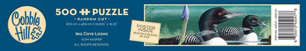 A hidden little cove with beautiful purple flowers and red eyed loons are the reason this pond is known as Iris Cove Loons. Take an adventure with Cobble Hill's 500 piece random cut puzzle made with textured linen print paper to reduce glare and a reference poster to help assemble the puzzle.