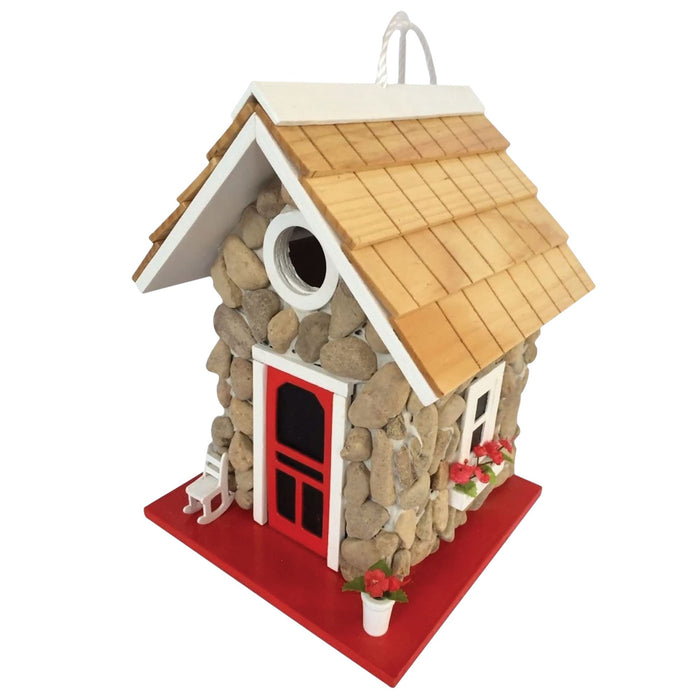 The Fieldstone Guest Cottage Birdhouse features a charming river stone façade complemented by a pine-shingled roof, creating a rustic yet refined aesthetic. Accented with a white-trimmed red door, a quaint window box, vibrant flower pot, and a classic white rocking chair, it offers inviting detail that enhances any garden setting. The 1.25" entrance hole is perfectly sized for small cavity nesters such as wrens, finches, chickadees, and nuthatches. Designed with bird enthusiasts in mind, this cottage includes a removable back wall for easy cleaning, proper drainage, ventilation, and an unpainted interior to ensure a safe and healthy nesting environment. The included heavy-duty nylon cord makes hanging simple, allowing you to position this delightful birdhouse where it can attract and shelter your local bird residents. Item Dimensions: 9. 5” H x 7“ W x 7” D. This is a best seller.