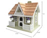 The Rosemary Cottage birdhouse is a charming companion to our Sweetheart Cottage, designed to create a welcoming birding refuge in your garden. Painted a soothing rosemary green, this beautiful hanging birdhouse is accented with delicate lavender-colored flower baskets that adorn its inviting front porch. Ornate white trim and a heart-shaped entry cutout provide both decorative appeal and easy bird access, encouraging nesting activity during the spring season. The handcrafted wood structure features an unpainted interior equipped with a screen ladder, thoughtfully installed to assist fledglings as they take their first flights into the world. Combining aesthetic grace with practical design, the Rosemary Cottage offers a delightful and functional habitat that is sure to enrich any backyard environment. Item Dimensions:7.5" H x 8.75"W x 6.25" D Hole 1.25"