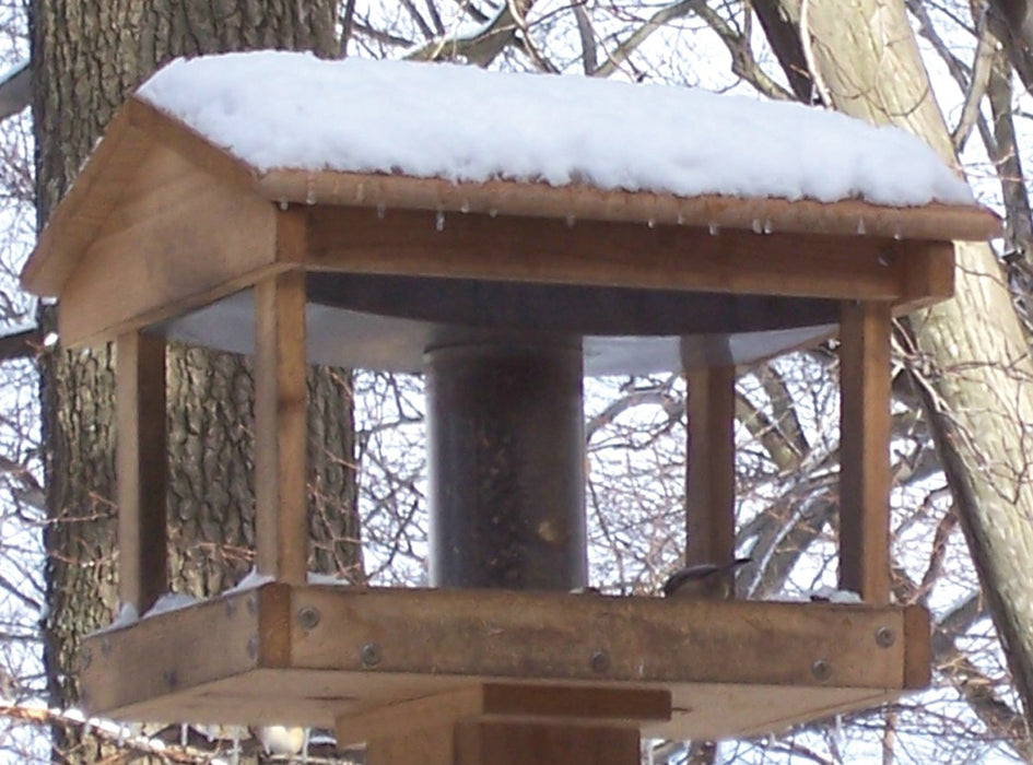 Galvanized steel seed hopper with plastic cylinder off the center piece of a feeding area and is a nice fly through feeder. 14 lb. capacity.