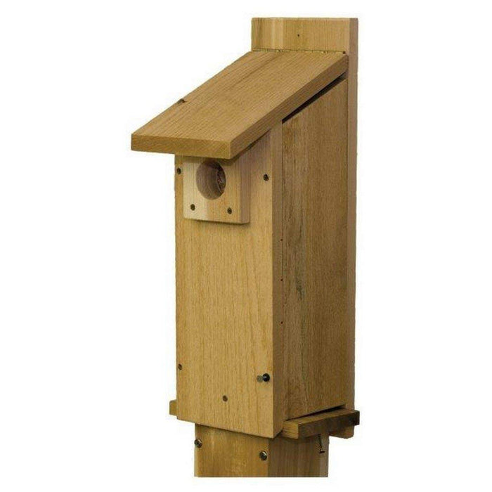 This house comes with shavings because normally these birds do not bring anything but feathers to the nest. All houses need to be cleaned out before the next season starts. We suggest doing it in the spring so the birds can roost in them during the winter. 19-inch x 6.75-inch x 10.75-inch. Stovall products feature all cedar construction, stainless steel and dichromate plated screws, washers, hooks and chains, hand sanded, assembled with screws, many products coated with wood protector which accents the wood grain and the natural warmth of cedar.