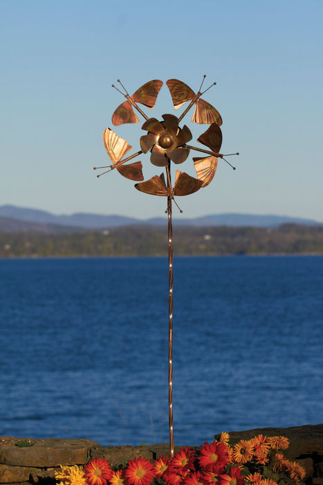 Flamed copper kinetic butterfly spinner that moves in the wind. A wonderful piece of art for the yard or garden.