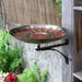The Red African Daisy Birdbath has a generous brass bowl with a bold embossed sunburst pattern and red patina accents. A threaded base on the underside of the bowl securely attaches the bowl to the forged wrought iron bracket. Ideal for porches, decks and fence posts, two mounting holes and hardware are provided.