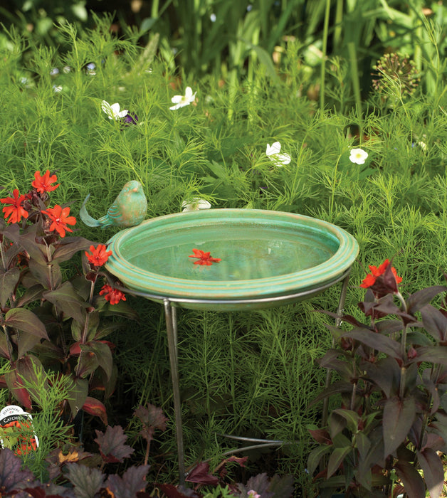 Invite birds into your environment with Ceramic leaf shaped birdbath with three legged metal stand. 2 pieces.