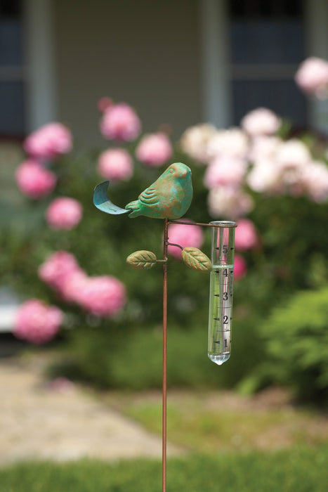 Ceramic and metal teal bird rain gauge. Glass measuring tube is included.