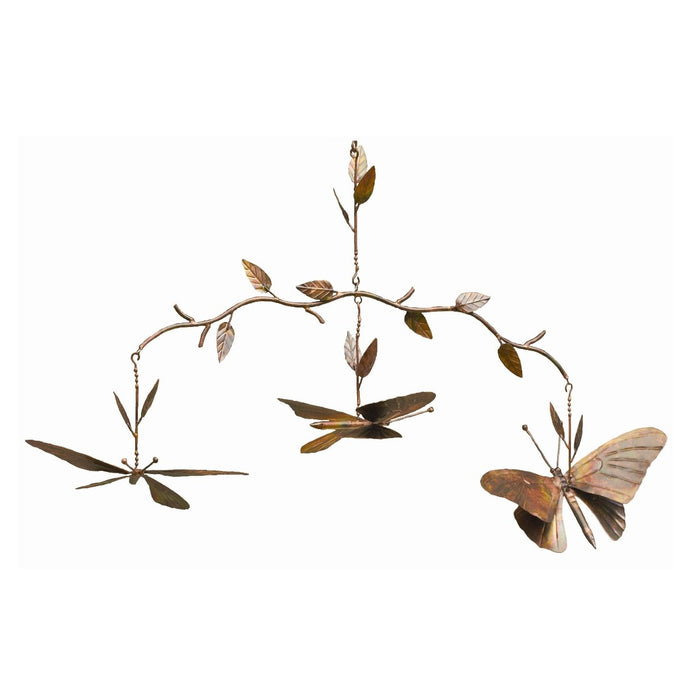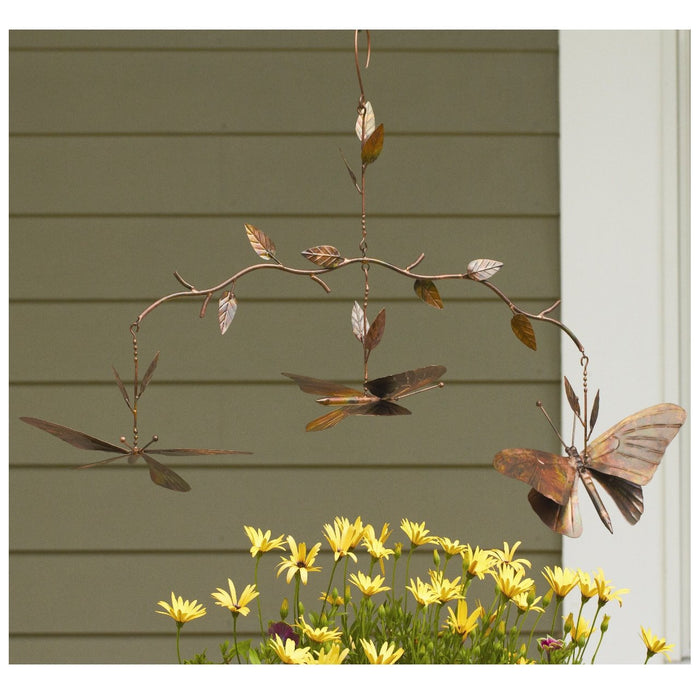 Flamed copper butterfly branch mobile that hangs from a tree or shepherd's hook and moves in the wind.