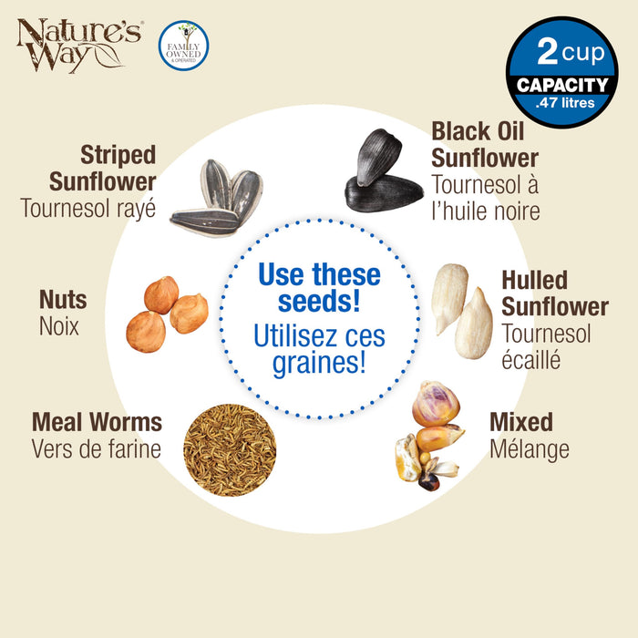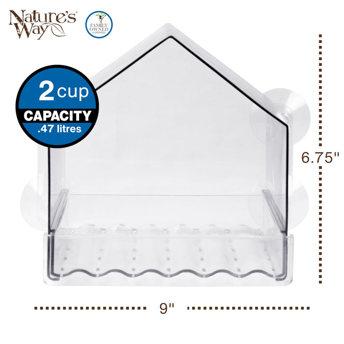 Improve your birdwatching experience inside and out with this unique window feeder! This feeder is built with a suction cup mounting system that attaches directly to your window, giving you a unique opportunity to view the birds up close like never before Unlike other window feeders, this feeder comes equipped with four side-mounted suction cups, providing you an unobstructed view of the birds The channeled and perforated seed tray design promotes optimum water drainage to keep seed fresher longer and also lifts out for easy filling and cleaning Easily detach the feeder from the window without removing the suction cup mounting system for quick and thorough cleanings A built-in rounded perch provides a comfortable grip, encouraging longer feeding time and increased bird viewing Constructed with durable, UV-stabilized, crack-resistant material, this feeder is sure to be a longtime favorite for you and the birds