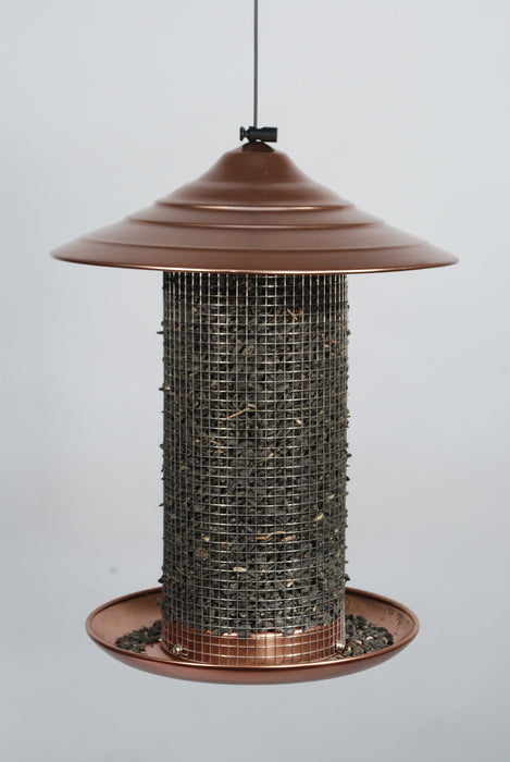 Brushed Copper Sunflower Feeder. Brushed copper black oil sunflower feeder. 3 lb capacity. Stainless steel screen.