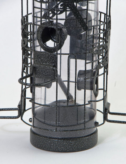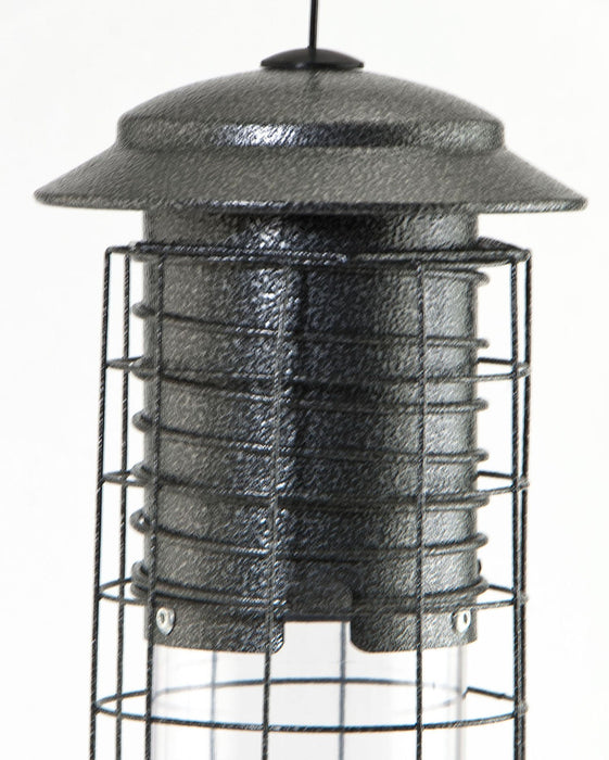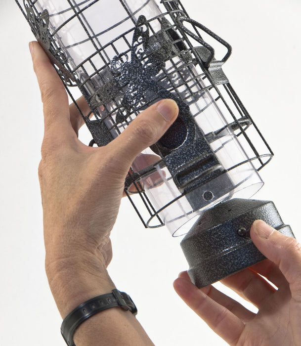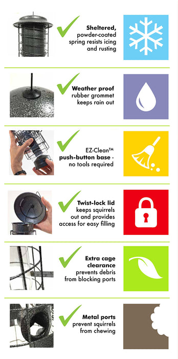 Squirrel proof hopper feeder has spring loaded perches to close seed access to unwanted guests