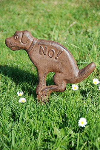 The subtle hint of this "No Pooping" yard sign will make the neighbors smile, while getting the real message across. Perfect for lawns, beaches, anywhere passing dogs decide to stop. Durable cast iron with antique rust finish gets the point across to dog walkers with a firm message to keep on going. Plants firmly into ground with cast molded stake.