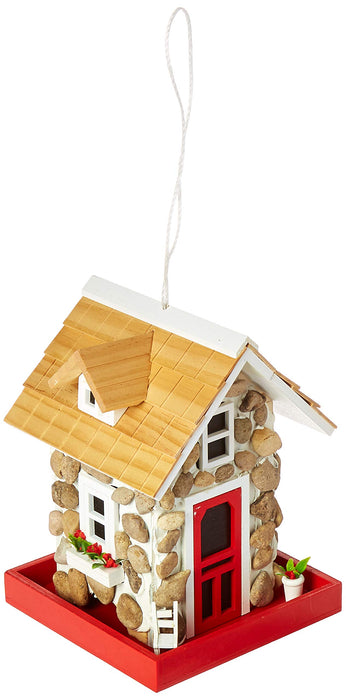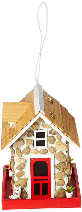 The Fieldstone Guest Cottage Birdfeeder combines charming design with practicality to create an inviting feeding station for your backyard birds. Featuring a durable pine-shingled roof and a sturdy river stone façade, this feeder is both weather-resistant and visually appealing. Accented with a window box, bright red flowers, a white-trimmed red door, and a classic white rocking chair, it adds a touch of cottage elegance to any outdoor space. Designed to hold up to 1.5 pounds of birdseed, it fills easily from the top, ensuring convenience and cleanliness. The heavy-duty nylon cord allows for secure hanging at your preferred height, attracting a variety of birds while complementing your garden’s natural beauty. This birdfeeder is an excellent choice for bird enthusiasts seeking a functional yet decorative addition to their feeding routine. Item Dimensions: 9. 5” H x 7“ W x 7” D.