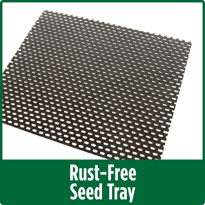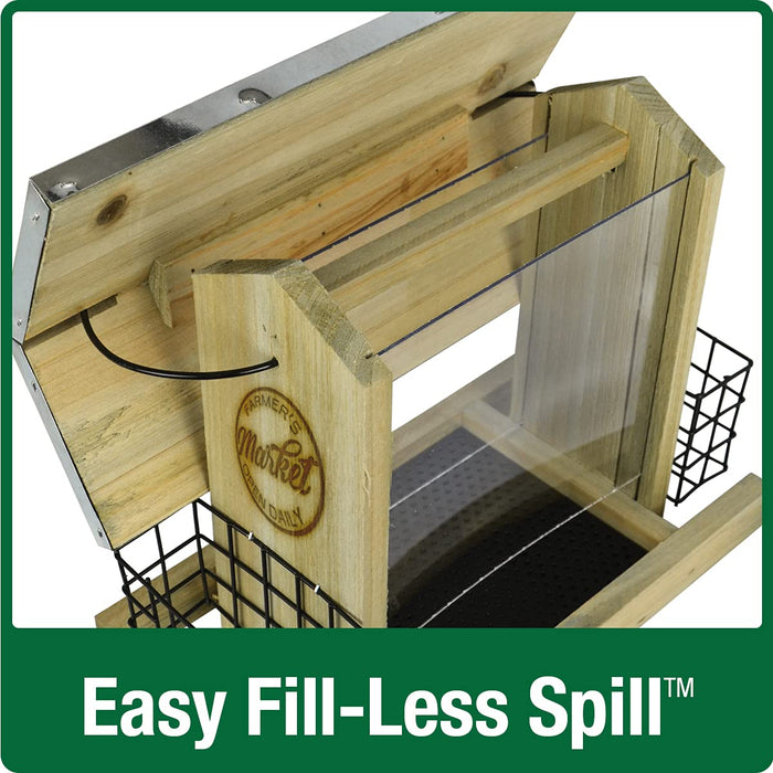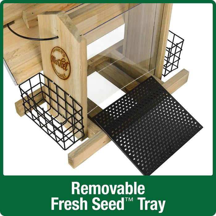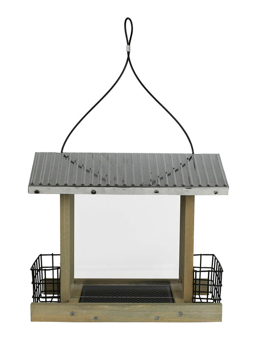 Weathered Stain and a textured galvanized roof bring a decorative rustic feel to your birding experience. Made with naturally insect and rot resistant premium cedar. The removable Fresh Seed tray keeps seed fresh longer while extending the life of the feeder. Spacing for large and small birds for attracting a wider variety of birds. Includes vinyl-coated steel hanging cable