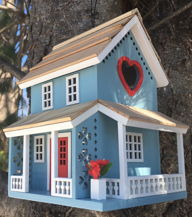 Sited for your garden or backyard this loveable home is ready for nesting. Sit back and relax as you wake up early and enjoy seeing the birds come flocking to the porch area, perfect for a small bird family. The Lovers Lane Cottage is a great oasis for you and your feathered friends, adorned with cut out details on the rails and house, a heart shaped entry outlined in red way welcomes the wrens, finches, chickadees and titmice. Keep this pristine home painted in sky blue and complete with a welcoming red door and lots of flowers is ready all year with its easy to access clean out, ventilation and drainage. Item Dimensions: 8”H X 6.25 ”W X 6.25”D Hole 1.25"