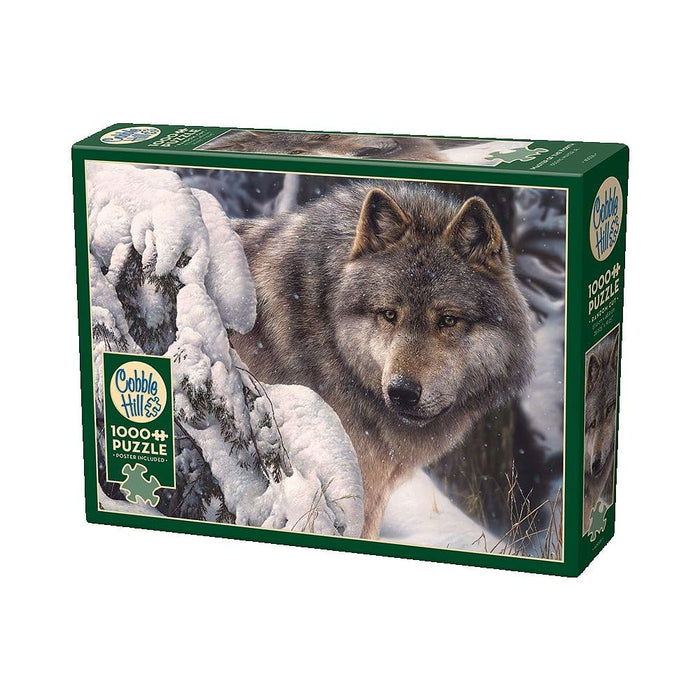 This wolf is the Master of the North and his keen eyes have spied something in the distance of the snow covered forest. This wolf does not plan to starve this winter. Difficult parts of this 1000 piece puzzle may be the darker out of focus background, but the beauty of the puzzle is in the detail of the fur!