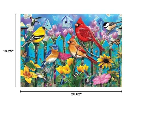 Sitting On The Fence are many different birds who appear to be enjoying the flowers and the busyness of the hummingbirds fluttering about. There are a lot of blue tones and pinks in this 500 piece puzzle with splashes of yellow in the bird and flowers. Also, there are Monarch butterflies and ladybugs to brighten up your day!