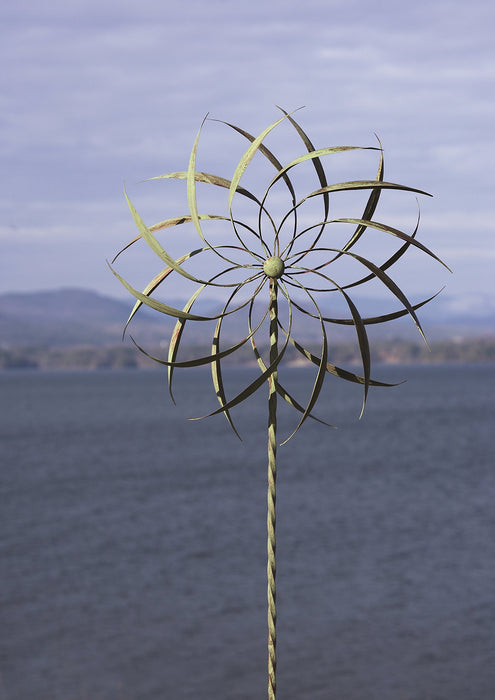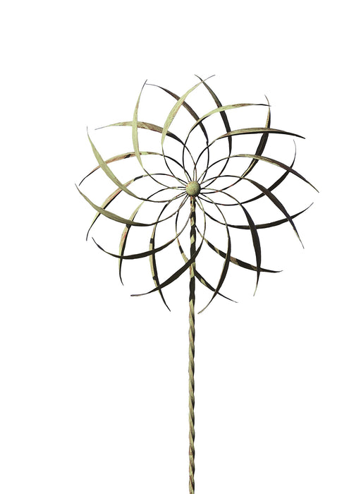 Pinwheel Large Twisted Stake. Kinetic pinwheel moves in gentle wind. A wonderful art piece for any garden or yard whether it is in motion or not. KD handcrafted. One side of the pinwheel should spin clockwise and one side should spin counter-clockwise. Must charge additional freight (applies to Brick and Mortar stores only).