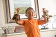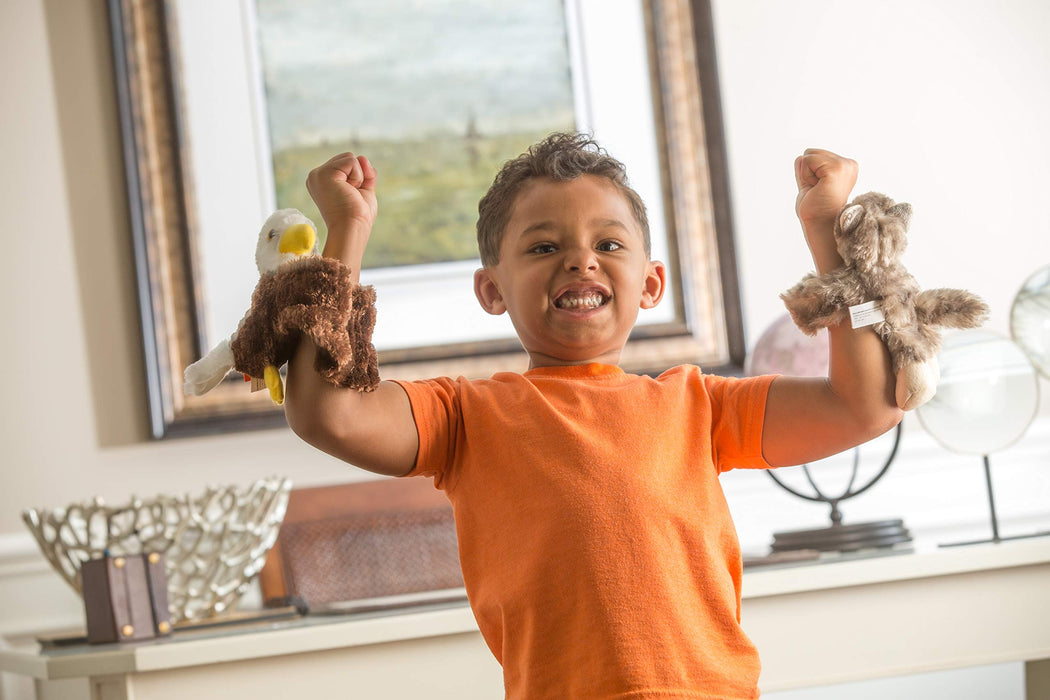 This small furry bald eagle stuffed animal is perfectly huggable. Spread the arms wide open. Give the chest a squeeze, then SNAP, the arms instantly wrap around and give you a hug. Hugs onto your wrist, backpack, stroller and so much more