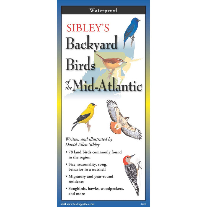 Sibley's Backyard Birds Mid-Atlantic FoldingGuide offers an authoritative resource for identifying 78 land bird species regularly seen across the Mid-Atlantic region, including southern New York (Long Island), Pennsylvania, New Jersey, West Virginia, Maryland, Delaware, Washington DC, and Virginia. Authored and illustrated by renowned ornithologist David Allen Sibley, this guide covers a wide variety of birds such as songbirds, raptors, woodpeckers, and more. Presented in a compact, six-panel fold-out format (each panel measuring 4" x 9"), it fits easily into a backpack, glove compartment, or on a kitchen table for quick reference. The indestructible waterproof lamination ensures durability in all weather conditions, providing instant access to critical identification details whenever needed. UPC: 740620901096; Item code: BBM-109.