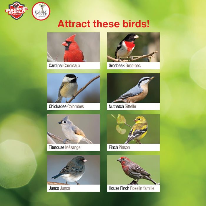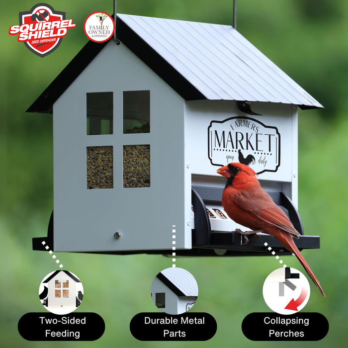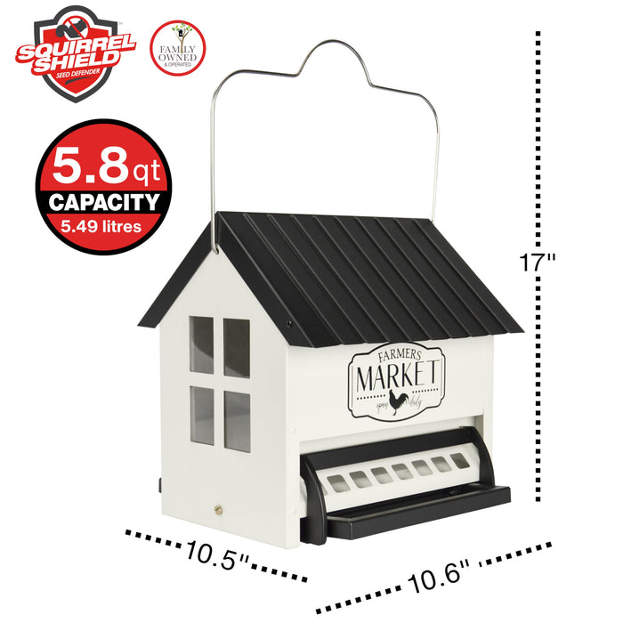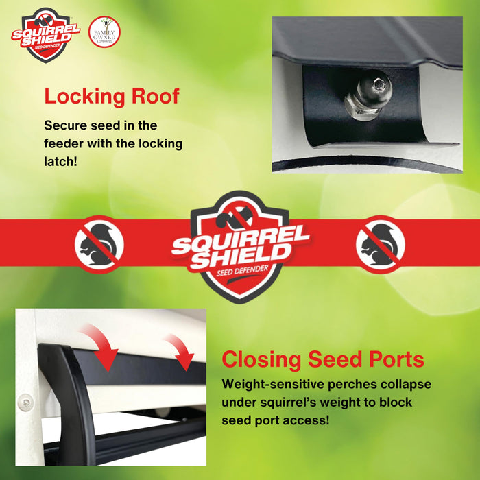 Add a touch of vintage farmhouse charm to your backyard birding experience while keeping the squirrels at bay with the Squirrel Shield Hopper Feeder This bird feeder features a 5 5 quart seed capacity for less frequent filling, viewing windows for monitoring seed levels, and a hinged locking roof with wide opening for easy refilling Weight-sensitive collapsing seed shields blocks squirrel access to seed, while collapsing perches make it harder for squirrels to gain a secure foothold on the feeder With dual-sided perches and a total of 16 feeding ports, this feeder is perfect for better bird viewing