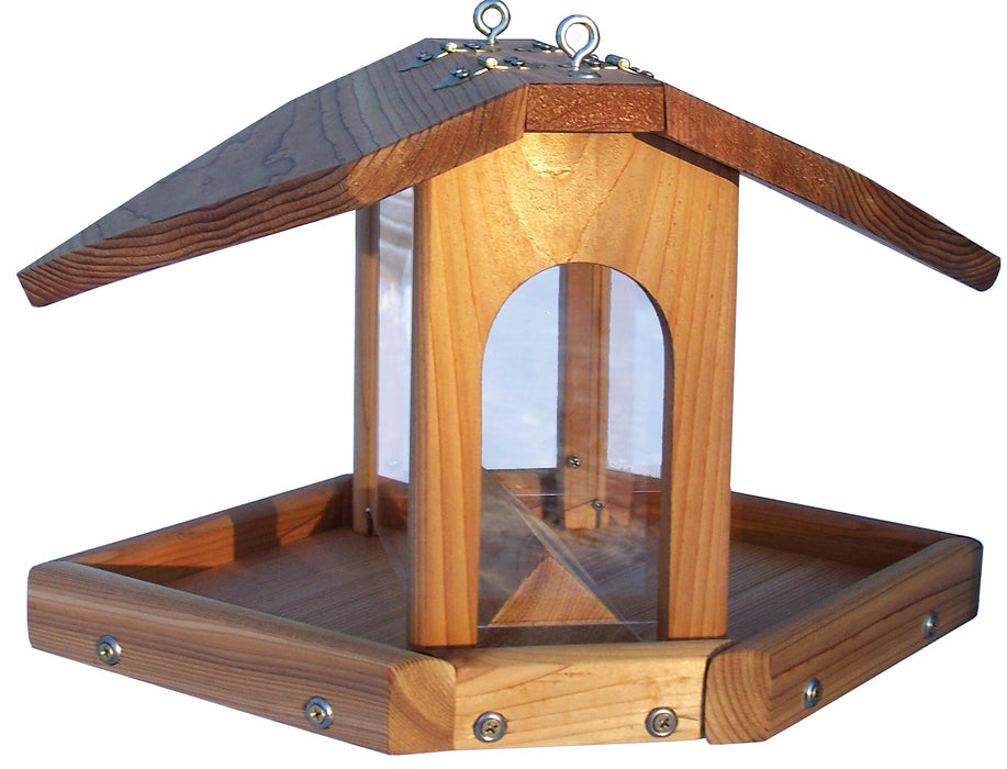 Mixed seed multi-side hanging feeder with a crossover hopper and landing deck. This feeder has great style and comes with chain for hanging. 5-6 lb. Capacity.