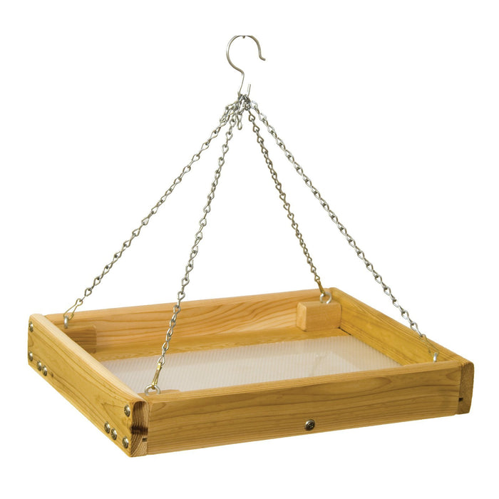 Small Hanging Tray Feeder with Perforated Plastic Floor. Includes chain and hook. Durable, long lasting construction. Sturdy and easy to use. Perforated tray allows water to drain out.