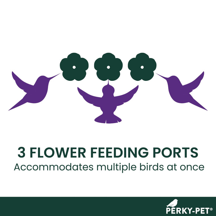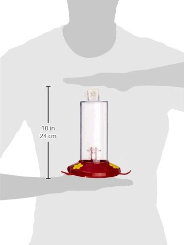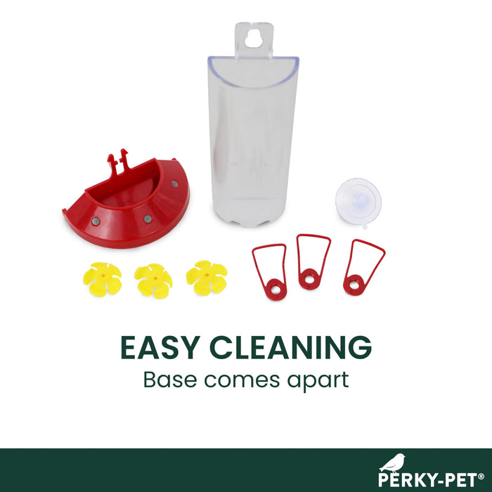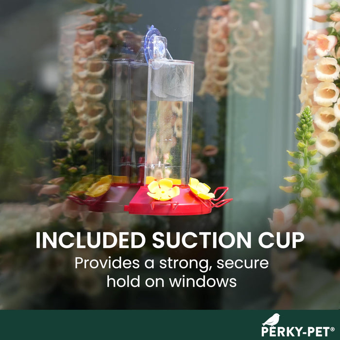 Perky-Pet's 8 oz Window-Mount Hummingbird Feeder features a no-drip feeding base with two easy feeding flowers and two perches. Mount the feeder on your window with the included suction cup or hang it with a screw or nail elsewhere. Kids love to watch the birds feeding, which is a great way to teach them about wildlife and migration. The feeder is easy to fill and clean. The Window Mount Hummingbird Feeder easily attaches to a window, wall, or post, so you can enjoy watching hummingbirds from the windows of your house. The clear acrylic feeder bottle is built for strength and durability. It has an 8 fl oz nectar capacity and quick release clips, so moving the feeder is easy and convenient. The feeder has an easy-to-clean wide-mouth design and a no-drip feeding base so nectar will not be wasted. The three feeding stations each have perches and snap-on yellow flower accents to add interest and attract hummingbirds.